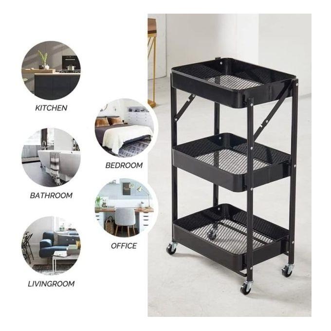 Construction Robuste : Fabriqué en acier au carbone résistant, ce chariot de rangement est conçu pour résister à une utilisation quotidienne tout en conservant sa solidité et sa stabilité.Trois Niveaux de Rangement : Avec trois étagères spacieuses, ce chariot offre amplement d'espace pour ranger une variété d'articles de cuisine, des ustensiles aux appareils électroménagers en passant par les ingrédients.Pliable et Compact : Grâce à sa conception pliable, ce chariot peut être rapidement et facilement replié pour un rangement compact lorsqu'il n'est pas utilisé, ce qui en fait une solution idéale pour les espaces restreints.Mobilité Facile : Équipé de roulettes robustes, ce chariot peut être facilement déplacé selon vos besoins, que ce soit pour servir des plats lors d'un dîner ou pour réorganiser votre espace de cuisine.Polyvalent : Ce chariot polyvalent peut servir de support supplémentaire pour votre espace de travail, une étagère de rangement pratique ou même un chariot de service lors de réceptions ou de rassemblements